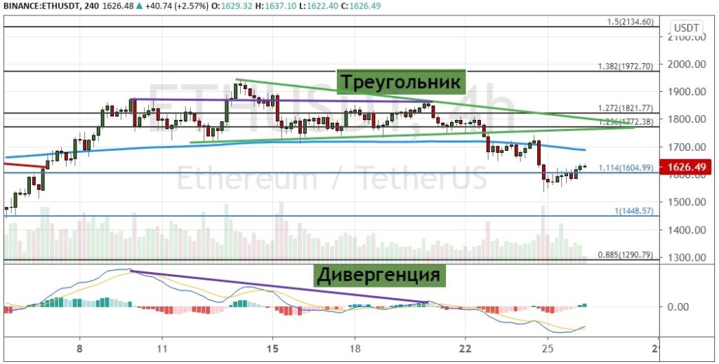Эфир реализовал прогноз о снижении стоимости от нижней границы области $1 772 – $1 820 и линии 200-дневной SMA к первой цели в районе $1 600 (11.4% расширение по уровням пропорции Фибоначчи). Сигналом к этому послужила дивергенция между ценой на графике и осцилляторе MACD, а также выход котировок ETH за рамки модели теханализа «Треугольник». Развитие нисходящего движения выглядит маловероятным, но медведи могут опустить цену к области $1 400 – $1 450 и уровню $1 290.