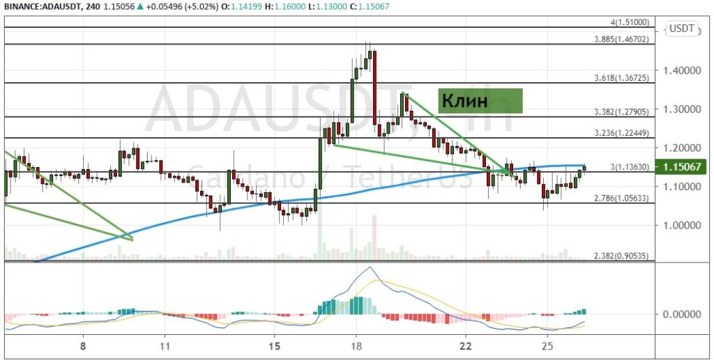 Котировки ADA достигли границ области поддержки $1.00 – $1.05, однако от них начался рост к отметке $1.20, где и проходят текущие торги. Однако возобновление нисходящей коррекции может привести к повторному снижению до $1.00 – $1.05 и тестированию уровней $0.9050 и $0.85.