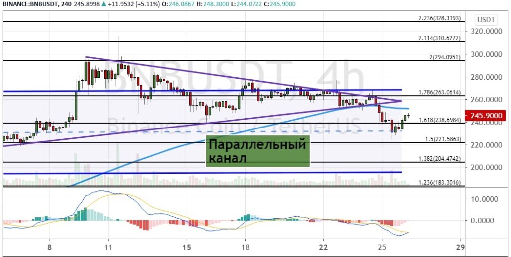 BNB после отскока от верхней границы модели теханализа «Параллельный канал» (представлена на графике ниже) и уровня $263 устремился к линии 200-дневной SMA и уровням поддержки $238 и $220. В перспективе медведи могут направить котировки BNB к цели на $200, где проходит нижняя граница «Параллельного канала».