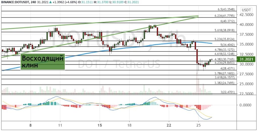 В случае если стоимость DOT не только восстановится до $34.40, но и уйдет выше $35.80, стоит ожидать роста к целям $38, $40$ и $41.80. А сохранение тенденции отправит котировки альткоина к уровням $43.40 и $45, рассчитанным по линиям пропорции Фибоначчи.