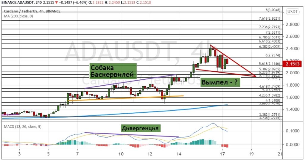 Но в случае ухода ADA ниже уровня $2 медведи могут перехватить инициативу и направить котировки к $1.9, $1.8, $1.6 и $1.5, где проходит линия 200-дневной SMA. В пользу этого указывает и «перекупленность» на осцилляторе MACD.