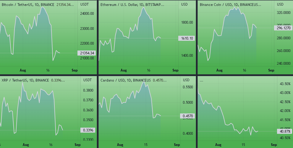 Динамика котировок BTC, ETH, BNB, ADA, XRP (дневной таймфрейм) и график доминации биткоина. Источник