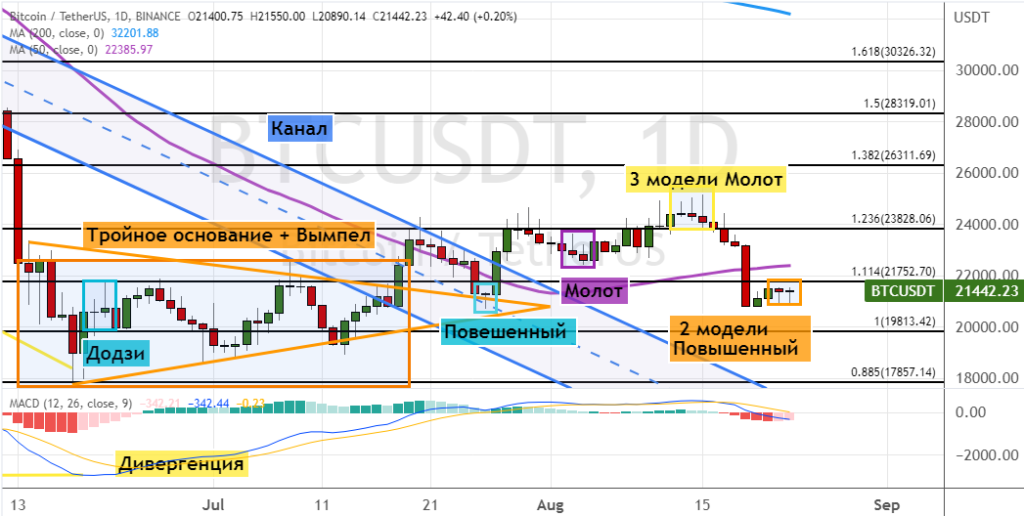 Если медведи пробьют уровень поддержки, то в рамках краткосрочной медвежьей динамики цена биткоина снизится до первой цели  $19 800. Более глубокая коррекция позволит медведям продавить котировки BTC до уровней $19 000 и $17 800. В пользу сохранения этого тренда все еще указывают три модели теханализа «Молот» (обозначены желтыми линиями) и сигнал в виде нескольких медвежьих моделей «Додзи» (линии бирюзового цвета). Также возможное формирование двух моделей «Повешенный» (линии оранжевого цвета) станет сигналом о продолжении снижения.
