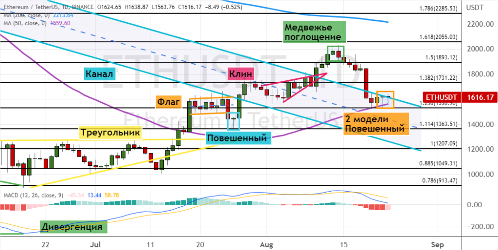 Стоимость эфира консолидируется в районе уровня $1 600, где также проходит линия 50-дневной SMA и верхняя граница модели теханализа «Нисходящий канал» (обозначена бирюзовым цветом).