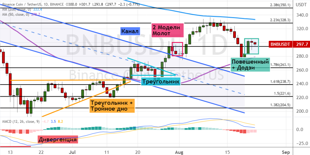 Но если быки смогут преодолеть уровни $330 и $340, между которыми проходит линия 200-дневной SMA, то это станет сигналом о развитии краткосрочной бычьей динамики. Она позволит котировкам BNB достичь первой цели — $350. В пользу реализации этого прогноза указывает сохранение актуальности двух моделей теханализа «Молот» (обозначены бордовым цветом), пробитие верхней грани «Нисходящего канала» (обозначена синим цветом) и границ двух моделей «Треугольник», продолжающаяся реализация модели «Тройное дно», а также дивергенция между ценой на графике и осцилляторе MACD.
