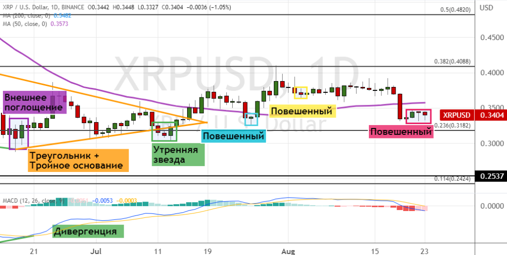 Но если дневные свечи закроются ниже поддержки $0.32, то в рамках краткосрочной медвежьей динамики котировки XRP устремятся к целям $0.3 и $0.28. Более глубокая коррекция приведет к падению котировок альткоина до границ кластера $0.24–$0.25. В пользу реализации этого прогноза указывает сигнал теханализа в виде возможного формирования двух моделей «Повешенный» (обозначены розовыми линиями).