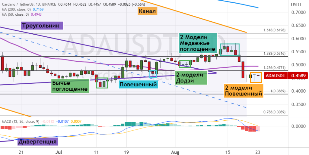 Если альткоину удастся пробить текущий уровень сопротивления $0.48, то быки смогут протестировать уровень $0.5, где также проходит линия 50-дневной SMA. Дальше они направятся к границам консолидации $0.53–$0.55. Сохранение краткосрочного восходящего тренда приведет к росту стоимости ADA до уровней сопротивления $0.60, $0.62, где также проходит верхняя граница модели теханализа «Нисходящий канал» (обозначен оранжевыми линиями), и $0.7, где расположилась линия 200-дневной SMA. В пользу реализации этого прогноза указывает модель «Бычье поглощение» (отмечена бирюзовым цветом на графике), две модели «Додзи», а также преодоление верхней границы «Треугольника», модель «Повешенный» (отмечена бирюзовым цветом на графике) и бычья дивергенция между ценой на графике и осцилляторе MACD.