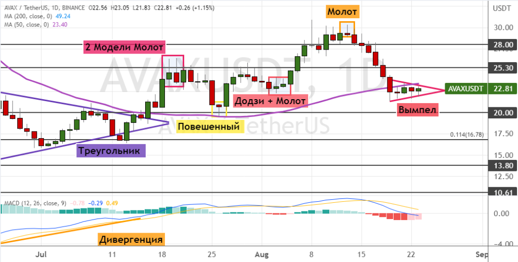 Закрытие дневных свечей ниже этого уровня, где также проходит линия 50-дневной SMA, будет сигналом о начале коррекции, которая позволит медведям продавить стоимость альткоина до уровней $20, $17, $15 и $13.80. В пользу реализации этого сценария торгов указывает возможное формирование модели «Вымпел» (отмечена темно-розовым цветом), а также сохранение актуальности модели «Молот» (отмечена оранжевым цветом) и еще двух моделей «Молот» (обозначены розовым цветом).
