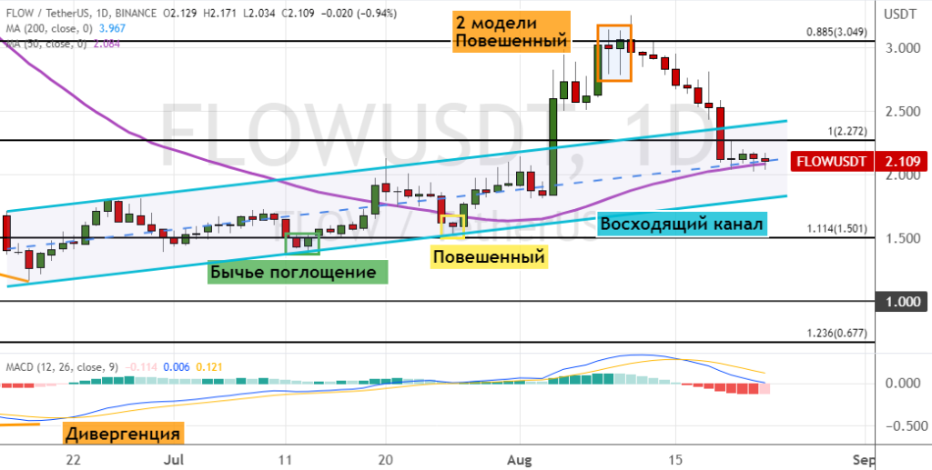 Закрытие дневных свечей выше границ кластера $2.27–$2.5 в рамках краткосрочного бычьего тренда направит котировки FLOW к границам консолидации $3–$3.5. В краткосрочной перспективе это приведет к росту стоимости FLOW до целей $3.8, $4 и $4.3. Между $4 и $4.3 также проходит линия 200-дневной SMA. В пользу развития этого варианта торгов указывают следующие сигналы: модель «Повешенный» (границы отмечены желтым цветом), «Бычье поглощение», а также вероятное преодоление верхней границы «Восходящего канала» и бычья дивергенция между ценой на графике и осцилляторе MACD.