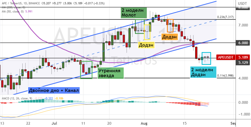 При этом сигналом о восстановлении бычьей динамики станет рост котировок APE выше уровней $6, где также проходит линия 50-дневной SMA и нижняя граница «Восходящего канала», и $7.3. Дальше быки будут готовы протестировать цели $8, где проходит верхняя граница модели теханализа «Восходящий канал» (обозначена синим цветом), и $9.2. В пользу реализации такого прогноза указывает два сигнала теханализа в виде моделей «Двойное дно» и «Утренняя звезда».
