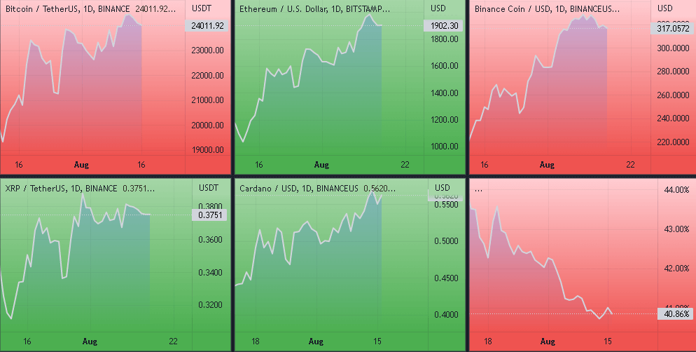 Динамика котировок BTC, ETH, BNB, ADA, XRP (дневной таймфрейм) и график доминации биткоина. Источник