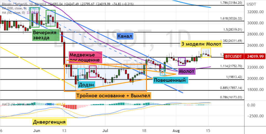 Но если котировки BTC пробьют уровни поддержки $23 000 и $23 800, это станет сигналом о восстановлении краткосрочной медвежьей динамики. В таком случае биткоин снизится к первым целям $21 800, где проходит линия 50-дневной SMA, $21 000 и $19 800. Более глубокая коррекция позволит медведям продавить BTC до уровней $19 000 и $17 800. В пользу реализации этого прогноза указывает вероятное формирование трех моделей «Молот» (обозначены желтыми линиями), сигналы в виде нескольких медвежьих моделей «Додзи» (линии бирюзового цвета) и «Медвежье поглощение», а также две свечные комбинации «Вечерняя звезда».
