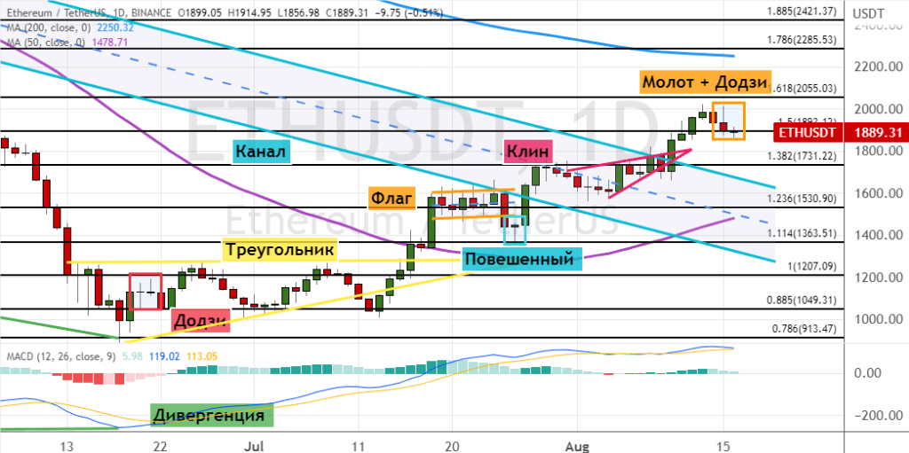 Если им удастся закрепиться выше сопротивления $2 000, то в рамках краткосрочного восходящего тренда быки смогут поднять стоимость актива выше границ кластера $2 000–$2 055. Сохранение бычьей динамики приведет к росту стоимости эфира до уровней $2 200 и $2 285, между которыми также проходит линия 200-дневной SMA. В пользу развития бычьей динамики указывает вероятное появление моделей «Молот» и «Додзи» (отмечены оранжевым цветом) и сигналы в виде преодоления верхней границы «Клина» (обозначена розовым цветом), модель «Флаг», формирование двух моделей теханализа «Повешенный» (отмечены оранжевым и бирюзовым цветом), а также прорыв верхней границы модели «Треугольник». Также в пользу роста указывает дивергенция между ценой альткоина на графике и осцилляторе MACD.