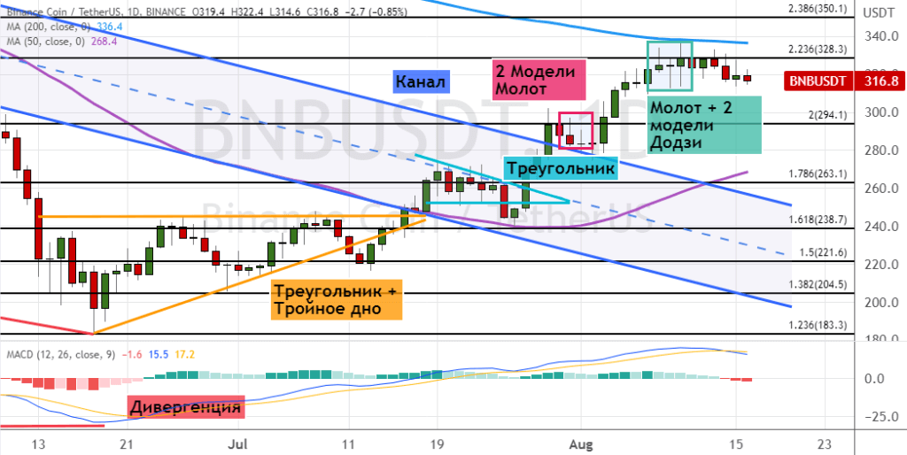 Но если быки смогут закрепиться выше $340, где также проходит линия 200-дневной SMA, то это станет сигналом о развитии краткосрочной бычьей динамики. Она позволит BNB достичь уровня $350. Сохранение восходящей динамики приведет к росту стоимости альткоина до уровня $366. В пользу реализации этого прогноза указывает вероятное формирование моделей «Молот» и двух фигур теханализа «Додзи» (обозначены бирюзовым цветом). Также в пользу бычьей динамики указывают шесть сигналов: пробитие верхней грани «Нисходящего канала» (обозначена синим цветом), две модели «Треугольник», модель «Тройное дно» и две модели «Молот», а также дивергенция между ценой на графике и осцилляторе MACD.