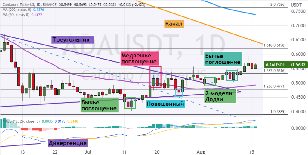 Если стоимость альткоина сможет пробить текущий урвоень сопротивления $0.60, то дальше ADA направится к уровням $0.62 и $0.7, между которыми также проходит верхняя граница модели теханализа «Нисходящий канал» (обозначен оранжевыми линиями). Сохранение краткосрочного восходящего тренда позволит быкам протестировать уровень $0.76, ниже которого расположилась линия 200-дневной SMA. В пользу реализации этого прогноза указывает модель «Бычье поглощение» (отмечена бирюзовым цветом на графике) и две модели «Додзи», преодоление верхней границы «Треугольника», а также еще одна модель «Бычье поглощение», модель «Повешенный» (отмечена бирюзовым цветом на графике) и бычья дивергенция между ценой на графике и осцилляторе MACD.