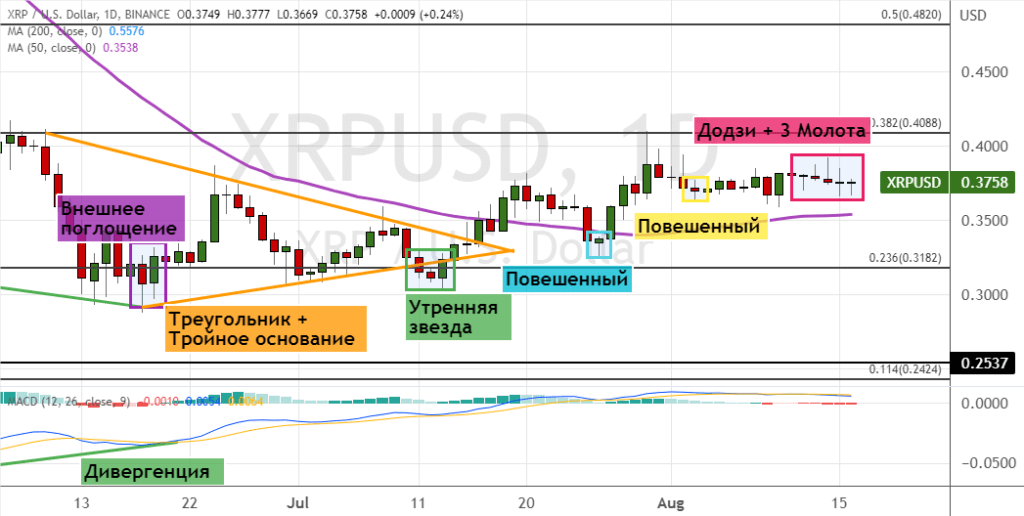 Если дневные свечи закроются ниже уровня поддержки $0.35, где также проходит линия 50-дневной SMA, это станет сигналом о развитии медвежьей динамики. В этом случае котировки XRP устремятся к первым целям медведей — уровням $0.32 и $0.3. Более глубокая коррекция приведет к обвалу стоимости альткоина до границ кластера $0.24–$0.25. В пользу реализации этого прогноза указывает сигнал теханализа в виде возможного формирования модели «Додзи» и трех моделей «Молот» (обозначены розовыми линиями).