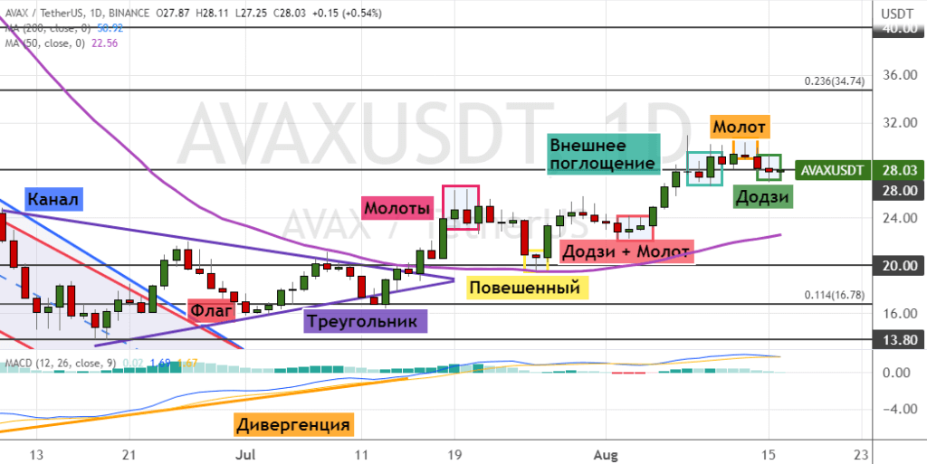 Закрытие дневных свечей выше сопротивления $30 станет сигналом о восстановлении восходящей динамики. В таком случае краткосрочный бычий тренд позволит стоимости AVAX подняться до первых целей $32, $34.80 и $40. В пользу развития этого сценария торгов указывает возможное формирование модели «Молот» (отмечена зеленым цветом) и восемь сигналов теханализа: модели «Додзи» и «Молот» (отмечены светло-розовым цветом), «Внешнее поглощение» (отмечена бирюзовым цветом) и «Повешенный» (отмечена желтым цветом), преодоление верхних границ моделей «Флаг», «Канал» и «Треугольник», а также бычья дивергенция между ценой на графике и осцилляторе MACD.