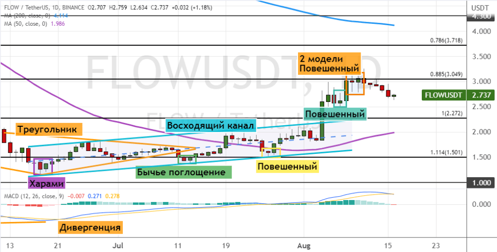 В случае падения FLOW ниже границ кластера $2.27–$2.5 медвежья динамика направит котировки к поддержкам $2 и $1.7, между которыми проходит линия 50-дневной SMA. Более глубокая коррекция приведет к снижению стоимости актива до границ консолидации $1.2–$1.5. В пользу развития краткосрочной нисходящей динамики указывает модель теханализа «Вечерняя звезда» и две модели «Повешенный» (обозначены оранжевым цветом).