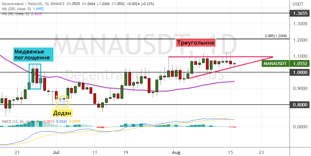 При этом падение котировок MANA ниже уровня $1, где также проходит линия 50-дневной SMA, в рамках медвежьей динамики приведет к обвалу стоимости альткоина до уровней $0.9 и $0.8. В пользу реализации этого прогноза указывает возможное пробитие нижней границы модели «Треугольник» и модель «Медвежье поглощение».