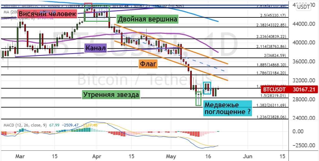 Четыре медвежьих сигнала все еще присутствуют на графике биткоина, а значит, нисходящее движение котировок BTC, вероятно, возобновится. Речь идет о моделях теханализа «Двойная вершина» (обозначена линиями зеленого цвета), «Медвежье поглощение» (обозначена бирюзовым цветом) и «Висячий человек», а также прорыве нижней границы «Канала» (обозначена линиями фиолетового цвета).