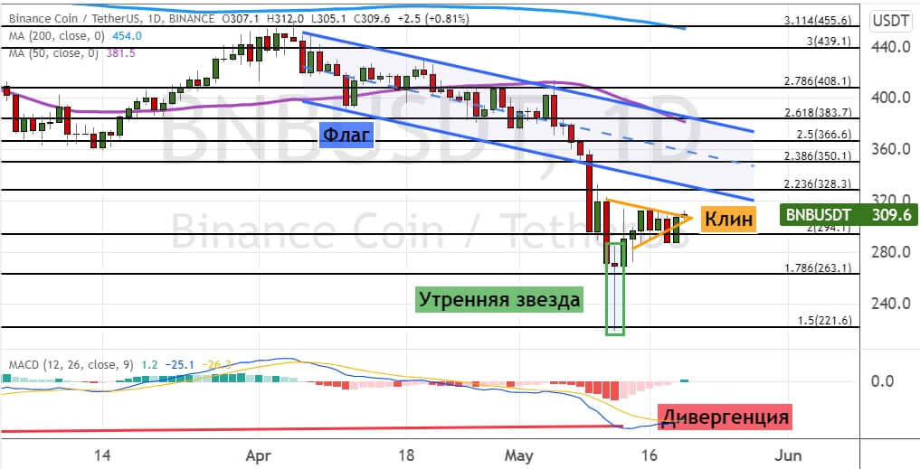 В то же время дивергенция между ценой на графике и осцилляторе MACD, а также модель теханализа «Утренняя звезда» (на графике ниже ее границы отмечены линиями зеленого цвета) указывают на возможное развитие бычьей динамики. Она направит котировки BNB к уровням сопротивления $328, $350 и $363. В районе этих уровней также проходят границы модели теханализа «Канал» (обозначены синим цветом).