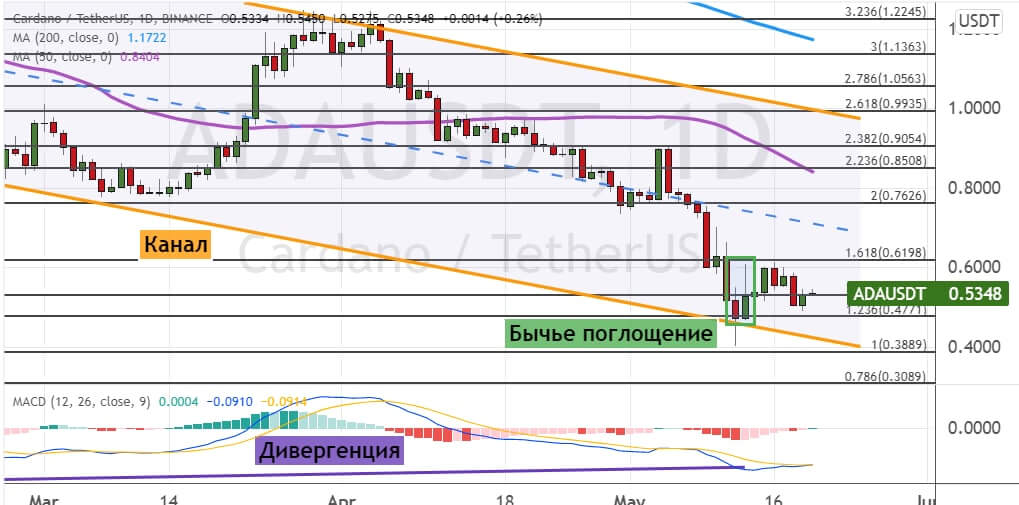 Однако если котировки альткоина смогут закрепиться выше уровней сопротивления $0.62 и $0.76, то это будет сигналом о восстановлении восходящей динамики. Она направит ADA к цели $0.85, где также проходит линия 50-дневной SMA, и границам кластера уровней $0.9 — $1.00. В пользу развития этой динамики торгов указывают два сигнала: модель теханализа «Бычье поглощение» (обозначена зеленым цветом) и бычья дивергенция между ценой на графике и осцилляторе MACD.