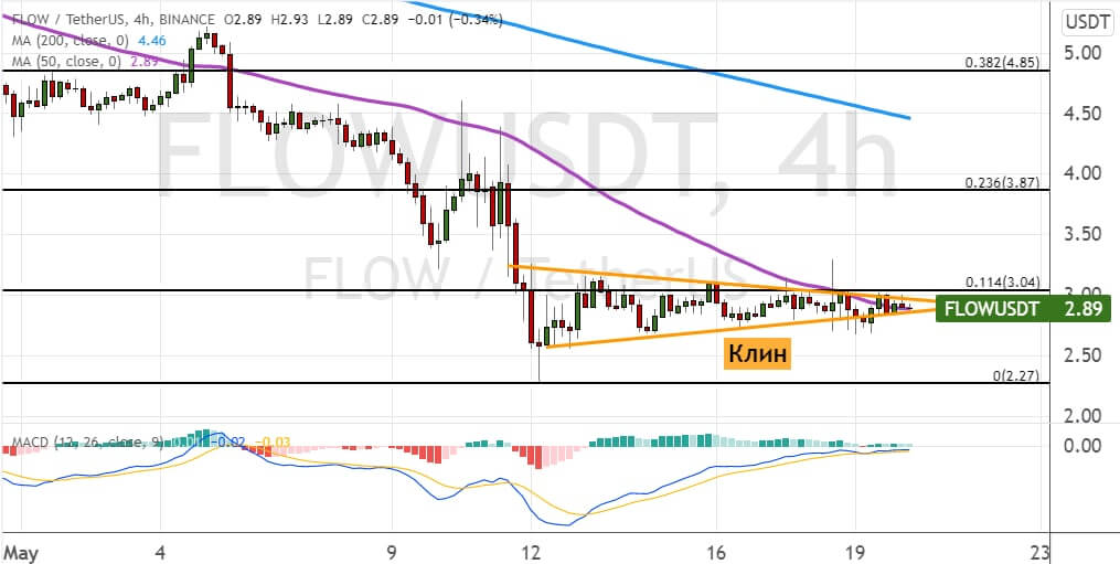 На первом месте на рынке NFT остается криптовалюта FLOW одноименной блокчейн-сети. Котировки альткоина продолжают движение в рамках модели теханализа «Клин» (обозначена оранжевым цветом). А текущие торги проходят в районе уровня $3, где проходит линия 50-периодной SMA.