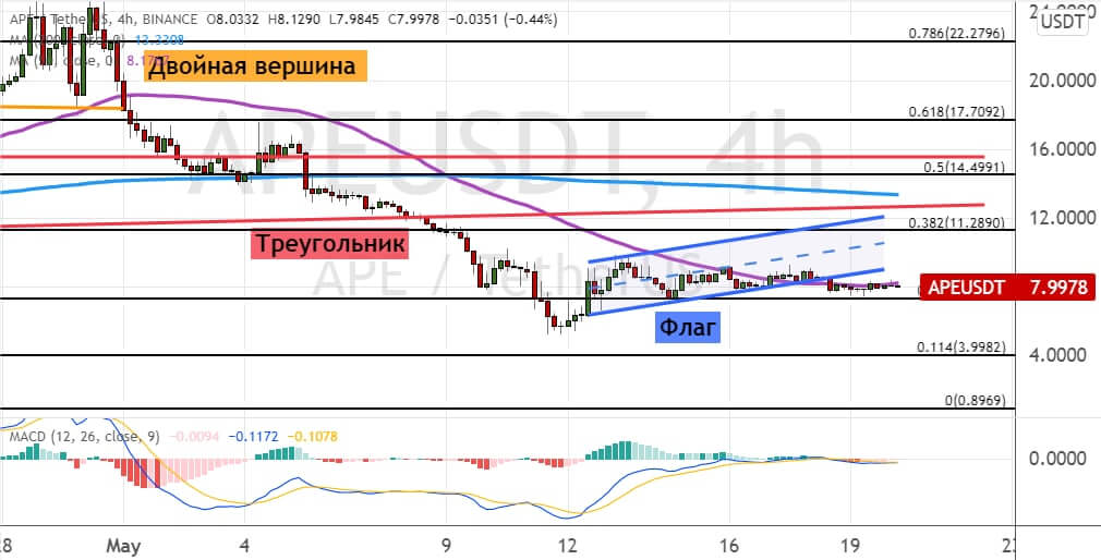 Сохранение нисходящего импульса приведет к обвалу стоимости APE до уровня $4. В пользу развития медвежьей динамики указывают три сигнала: формирование модели теханализа «Двойная вершина» (отмечена линиями оранжевого цвета), а также прорыв границ моделей «Треугольник» (отмечена линиями красного цвета) и «Флаг».