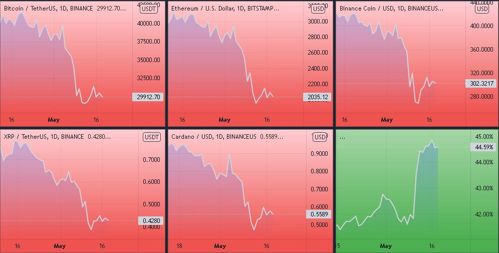 Динамика котировок BTC, ETH, BNB, XRP, ADA (дневной таймфрейм) и график доминации биткоина. Источник