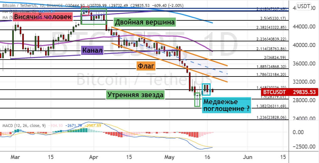 Сейчас быкам важно подняться выше уровней сопротивления $33 200 и $34 800, где также проходят границы модели теханализа «Флаг» (обозначены линиями оранжевого цвета). Сохранение бычьей динамики приведет к восстановлению краткосрочного восходящего тренда. В таком случае цели быков будут расположены на уровнях $36 800 и $38 800, где также проходит линия 50-дневной простой скользящей средней (SMA). В пользу этой идеи указывает сигнал в виде модели теханализа «Утренняя звезда» (обозначена линиями зеленого цвета).