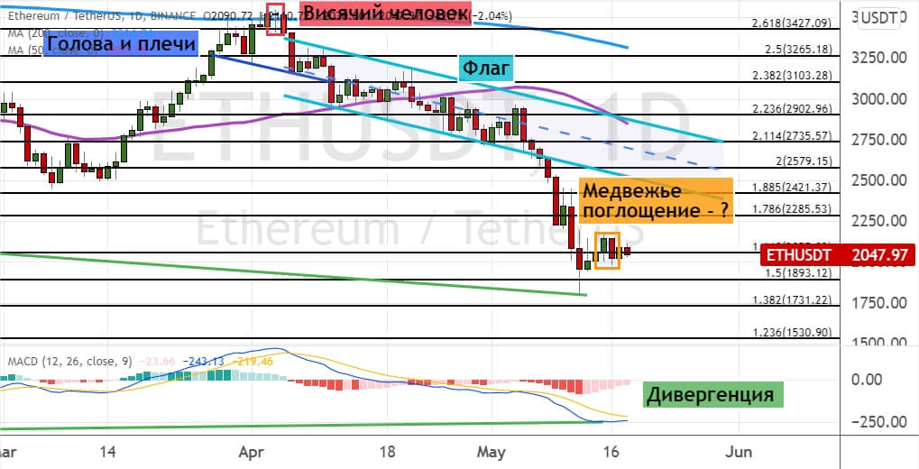 Сохранение коррекционной динамики выглядит наиболее вероятным вариантом развития торгов. Она приведет к падению стоимости эфира до уровней $1 900, $1 730 и $1 530. В пользу реализации этого прогноза указывают четыре сигнала: модели теханализа «Голова и плечи» (границы отмечены линиями синего цвета), «Медвежье поглощение» (обозначена оранжевым цветом) и «Висячий человек», а также прорыв нижней границы модели «Флаг».