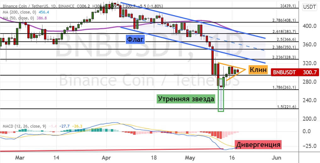 Котировки BNB продолжают консолидироваться в районе уровня $300, а их движение приобретает вид модели теханализа «Клин» (обозначена на графике ниже оранжевым цветом).