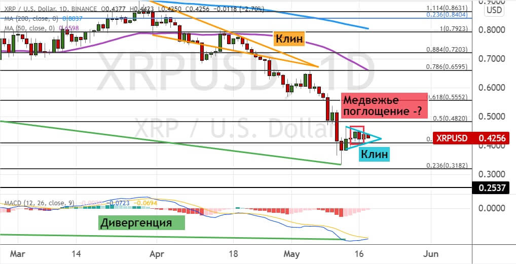 Если котировки XRP опустятся ниже $0.41, то следующую поддержку альткоин найдет на уровнях $0.32 и $0.25. В пользу развития этого сценария торгов указывают два сигнала: пробитие границ модели теханализа «Клин» (обозначены оранжевым цветом) и формирование модели «Медвежье поглощение».