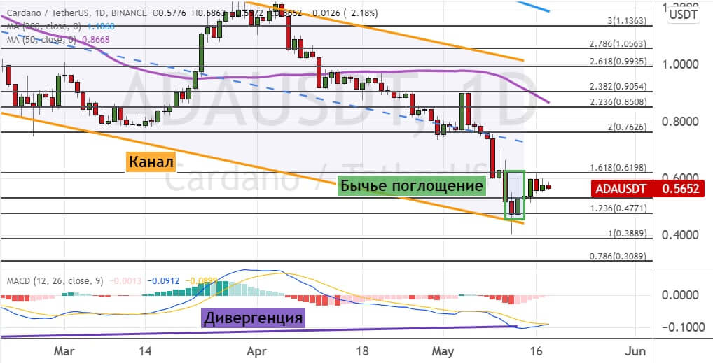 Котировки ADA оттолкнулись от нижней границы модели теханализа «Канал» (обозначена оранжевым цветом) и направились к уровням $0.5 и $0.62, между которыми проходят текущие торги альткоином. Если ADA опустится ниже $0.5, то поддержку альткоин найдет на уровнях $0.48 и $0.4. Падение ниже этих уровней, а также пробитие нижней границы «Канала» будет сигналом о снижении стоимости ADA до $0.35 и $0.3.