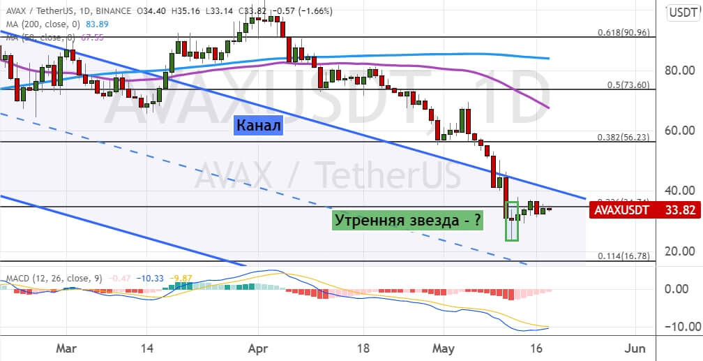 Первой целью и ключевым сопротивлением для котировок AVAX остается уровень $40. Если быкам удастся закрепиться выше него, то дальше альткоин направится вверх к уровню $56 и границам консолидации $74 — $90, в районе которых проходят линии 50-дневной и 200-дневной SMA. В пользу реализации этого сценария торгов указывает сигнал в виде модели теханализа «Утренняя звезда» (обозначена на графике ниже линиями зеленого цвета).