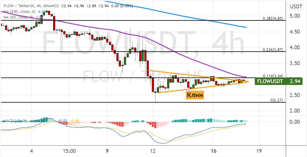 На первое место на рынке NFT вышла криптовалюта FLOW одноименной блокчейн-сети. Котировки альткоина расположились ниже уровня $3, где проходит линия 50-периодной SMA. На графике FLOW тоже начала формироваться модель теханализа «Клин» (обозначена на графике ниже линиями оранжевого цвета).