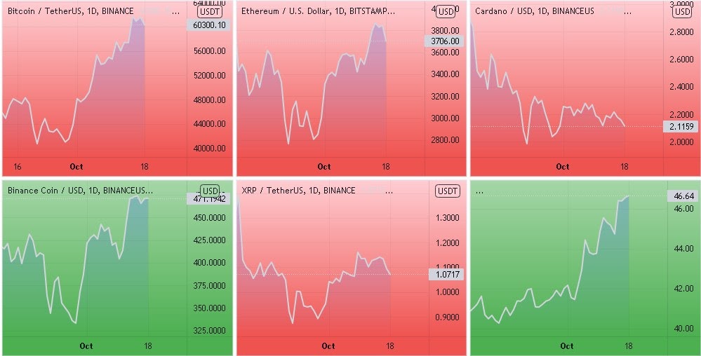 Динамика котировок BTC, ETH, ADA, BNB, XRP (дневной таймфрейм) и график доминации биткоина. Источник