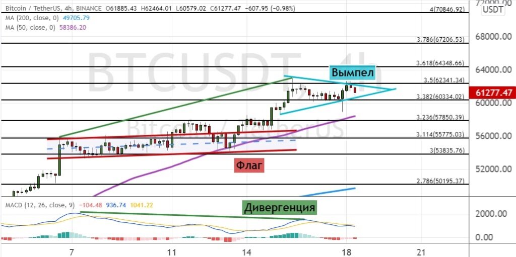 BTC не смог закрепиться выше сопротивления $62 340 и опустился до поддержки на уровне $60 300. Сейчас котировки актива двигаются в рамках границ модели теханализа «Вымпел» (показана на графике ниже бирюзовым цветом).