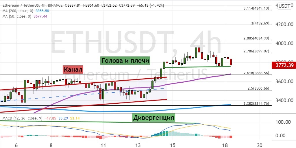 Формирование модели теханализа «Голова и плечи» (показана на графике ниже зеленым цветом) указывает на то, что стоимость эфира может опуститься ниже $3 670.  Первой целью для нисходящей динамики выступает уровень $3 500, а закрепление ниже него направит котировки к $3 300, где проходит линия 200-периодной SMA.