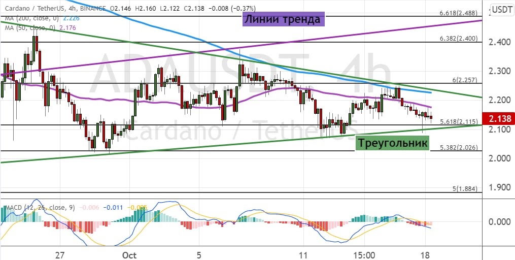 В последние дни котировки ADA торгуются в районе поддержки $2.11, где проходит нижняя граница модели теханализа «Треугольник» (показана на графике ниже зеленым цветом). Первой целью для медведей выступает район $2. А более серьезная коррекция приведет к падению стоимости ADA до уровней $1.9 и $1.75.