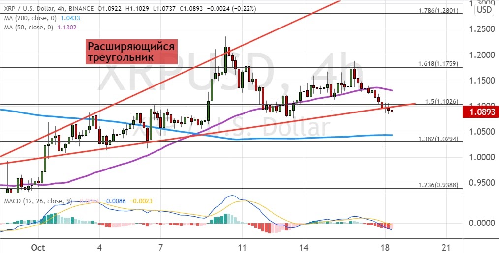 XRP торгуется между уровнем поддержки $1.10, где проходят линии 50-периодной SMA и модели теханализа «Расширяющийся треугольник» (показана на графике ниже бордовым цветом), и поддержкой $1.18. Сохранение нисходящего импульса направит котировки XRP к первой цели $1.02, где также проходит линия 200-периодной SMA. Уход ниже этого уровня позволит XRP направиться к уровню $0.94 и границам кластера $0.72–$0.80.