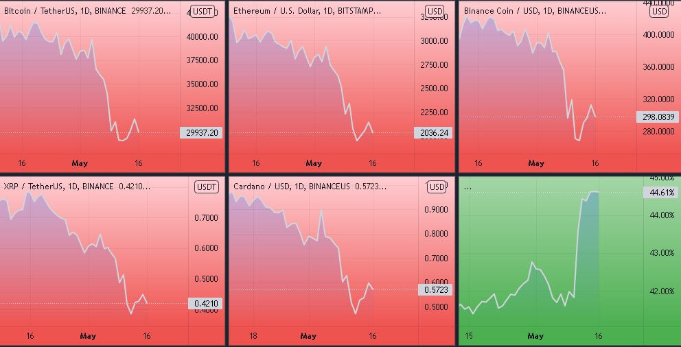 Динамика котировок BTC, ETH, BNB, XRP, ADA (дневной таймфрейм) и график доминации биткоина. Источник