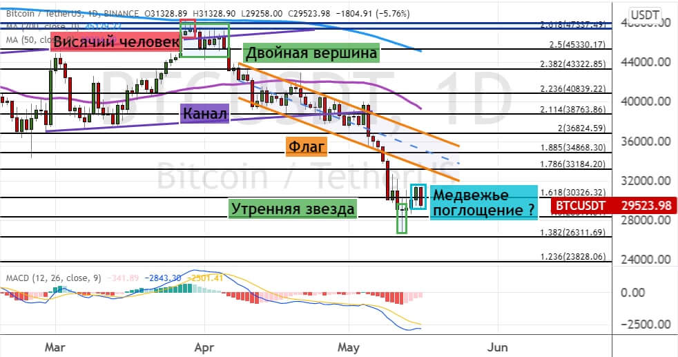 Котировки BTC расположились ниже уровня $30 000. Сохранение нисходящего тренда приведет к снижению стоимости биткоина до уровней поддержки и первых целей для медведей $28 300 и $26 300. Более глубокая коррекция откроет путь для движения котировок BTC к $23 800 и $20 000. Четыре сигнала теханализа указывают на вероятную реализацию этого прогноза: модели «Двойная вершина» (обозначена линиями зеленого цвета), «Медвежье поглощение» (обозначена бирюзовым цветом), и «Висячий человек», а также прорыв нижней границы «Канала» (обозначена на графике ниже линиями фиолетового цвета).