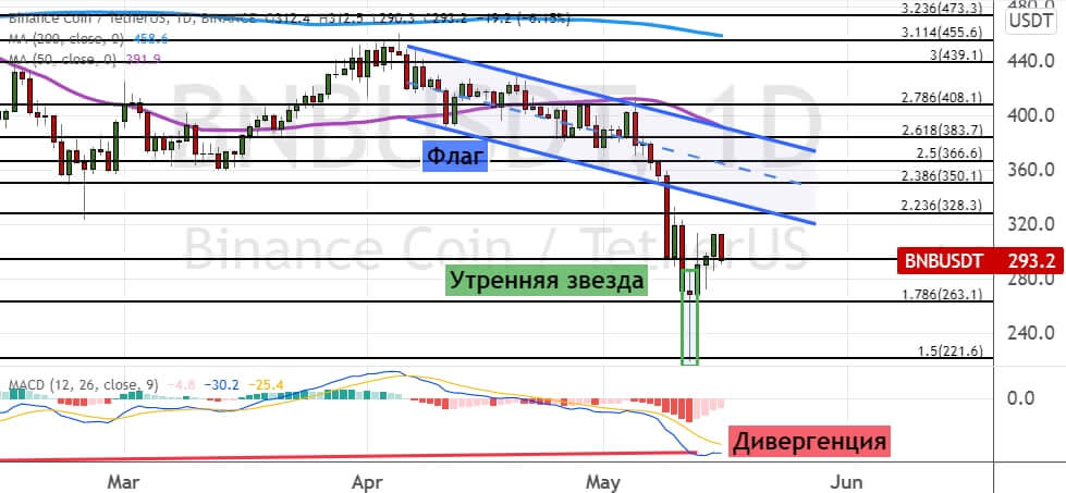 При этом сигналом о развитии восходящей динамики послужит рост стоимости BNB выше уровней сопротивления $328 и $350. Здесь также проходят границы модели теханализа «Канал» (обозначена на графике ниже оранжевым цветом). Сохранение восходящего тренда приведет к росту котировок BNB до уровней $363 и $380, где проходит линия 50-дневной SMA и границы консолидации $410 — $420. В пользу этого сценария указывают два сигнала: дивергенция между ценой на графике и осцилляторе MACD, а также модель теханализа «Утренняя звезда» (на графике ниже ее границы отмечены линиями зеленого цвета).