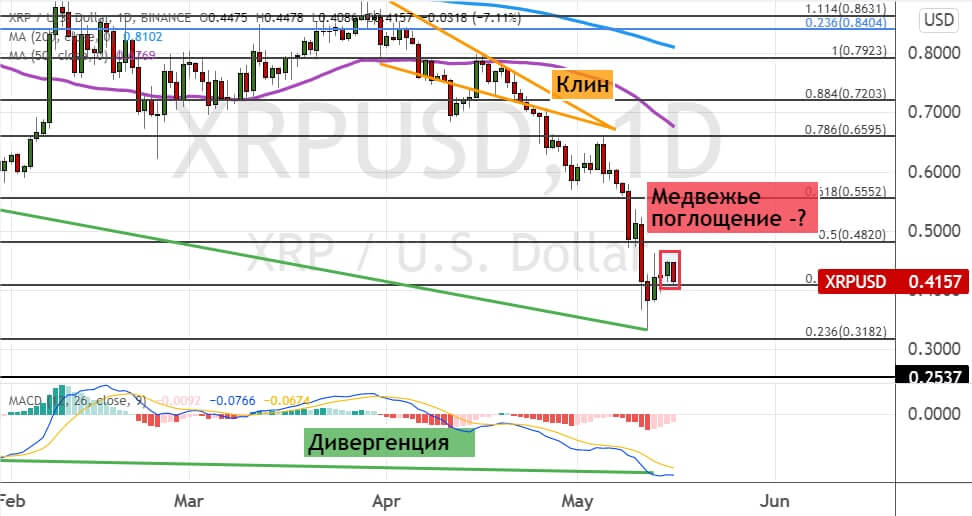 При этом на графике XRP также сохраняется сигнал в виде дивергенции между ценой на графике и осцилляторе MACD, указывающий на восстановление восходящей динамики. Подтверждением этого послужит рост XRP выше уровней $0.48 и $0.55. В таком случае первыми целями для быков послужат уровни $0.66 и $0.72, между которыми проходит линия 50-дневной SMA. В среднесрочной перспективе котировки XRP могут направиться к уровню $0.8, где также проходит линия 200-дневной SMA.