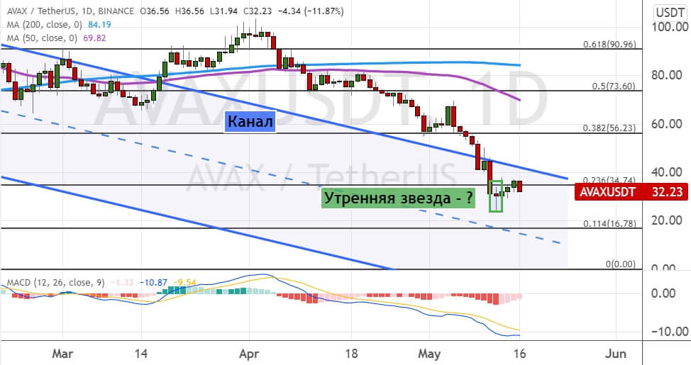 Первой важной целью и ключевым сопротивлением для AVAX выступает уровень $40, где также проходит верхняя граница модели теханализа «Канал» (обозначена на графике ниже линиями синего цвета). Сохранение импульса на рост приведет к движению котировок альткоина к уровню $56 и границам консолидации $74 — $90, между которыми проходят линии 50-дневной и 200-дневной SMA. В пользу реализации этого сценария торгов указывает сигнал в виде модели теханализа «Утренняя звезда» (обозначена на графике ниже линиями зеленого цвета).