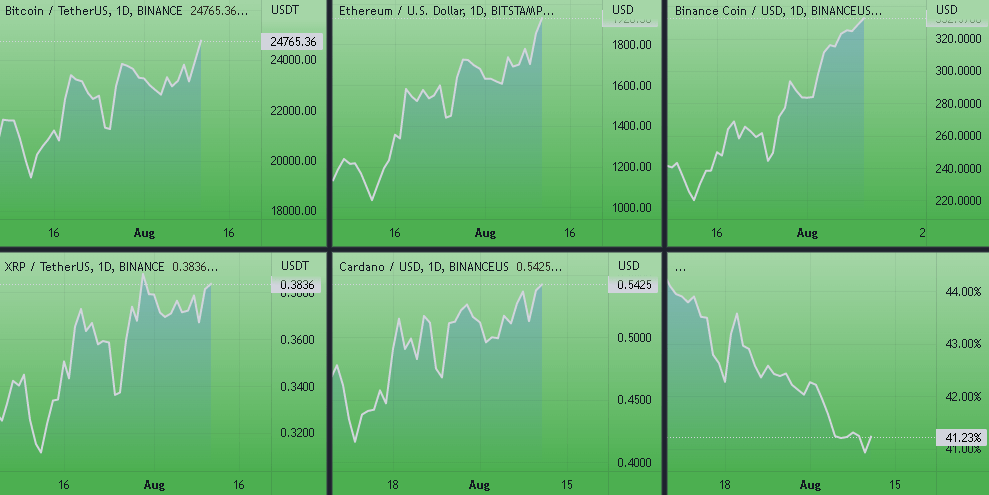 Динамика котировок BTC, ETH, BNB, ADA, XRP (дневной таймфрейм) и график доминации биткоина. Источник