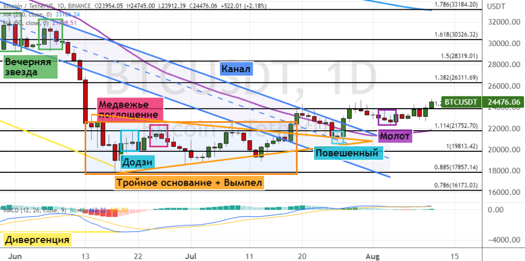 Закрытие дневных свечей выше текущего уровня сопротивления станет сигналом о восстановлении краткосрочной восходящей динамики. Первая цель для быков — уровень $25 000. Дальше биткоин будет готов протестировать уровни $26 300, $28 300 и границы консолидации $30 300–$33 200, где также проходит линия 200-дневной простой скользящей средней (SMA). В пользу восстановления краткосрочного восходящего тренда указывают шесть сигналов теханализа: модели «Молот», «Тройное основание», «Повешенный» (обозначена бирюзовым цветом), прорыв верхних границ моделей «Вымпел» и «Нисходящий канал», а также бычья дивергенция между ценой на графике и осцилляторе MACD.