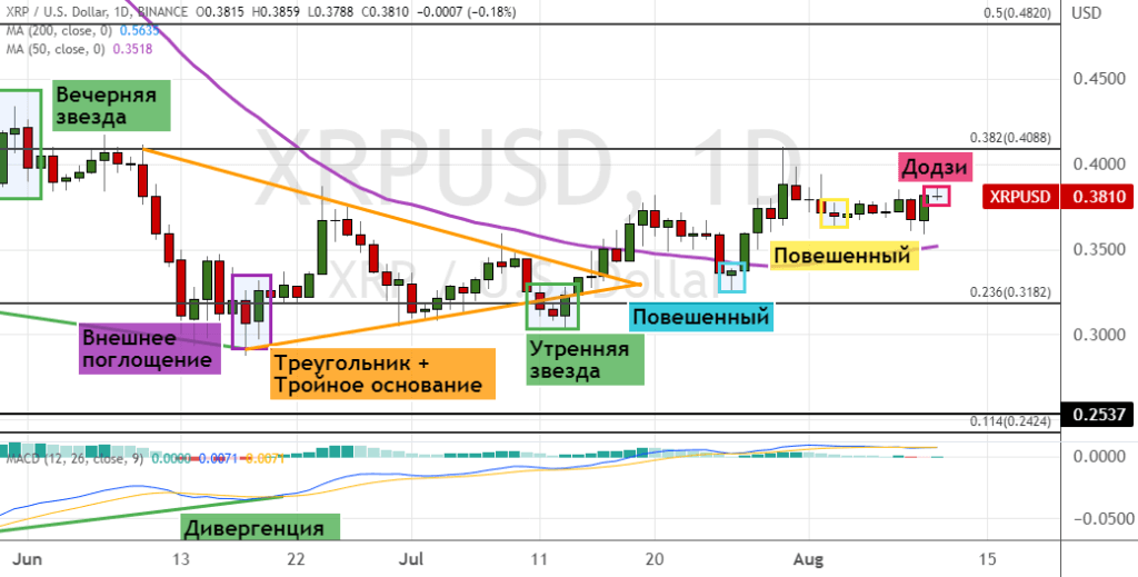 Шесть перечисленных сигналов теханализа указывают на продолжение роста XRP: преодоление верхней границы «Треугольника», модели «Повешенный» (границы отмечены желтым и бирюзовым цветом), «Тройное основание», «Утренняя звезда», «Внешнее поглощение» и бычья дивергенция между ценой на графике и осцилляторе MACD.