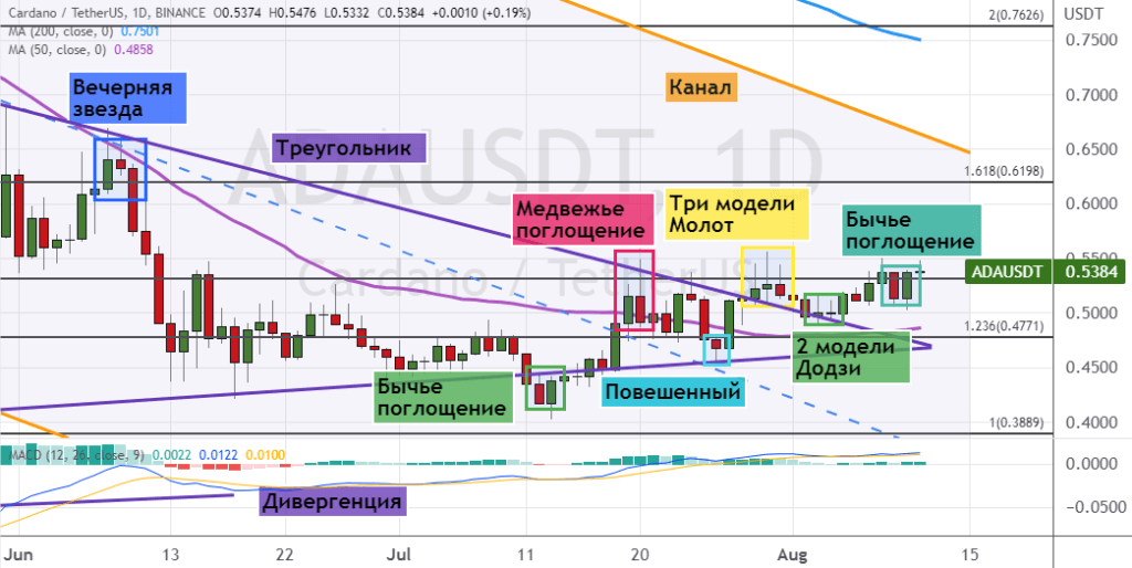 При этом закрытие дневных свечей ниже уровня поддержки $0.5, где также проходит линия 50-дневной SMA и верхняя граница «Треугольника», станет сигналом о развитии краткосрочной медвежьей динамики. В этом случае первыми целями для медведей станут уровни $0.48 и $0.45. Более глубокая коррекция приведет к снижению котировок ADA до уровней $0.4 и $0.35. В пользу реализации этого прогноза указывают пять сигналов: модель «Медвежье поглощение» (границы обозначены розовым цветом), три модели «Молот» (обозначены желтым цветом) и «Вечерняя звезда» (обозначена синим цветом).